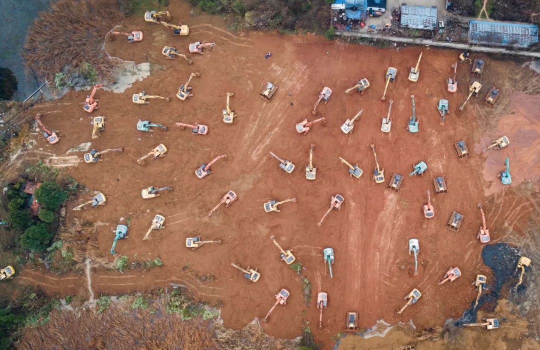 1月24日,火神山醫院開建,大型機械加緊施工。