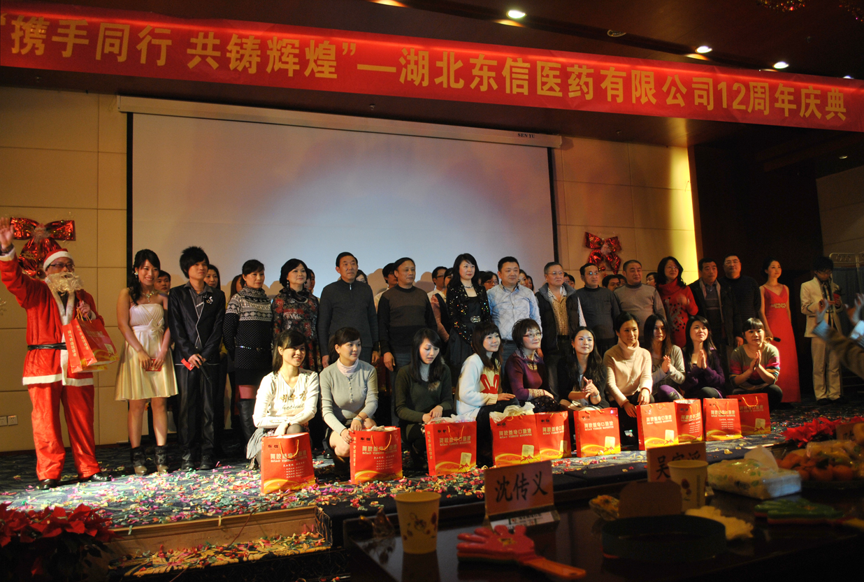 攜手同行,共鑄輝煌。踏著2010年冬天的第一場雪,湖北東信醫(yī)藥有限公司迎來了12周年華誕。12月24日,湖北東信醫(yī)藥有限公司12周年慶典在武漢市通院賓館隆重舉行。東信醫(yī)藥集團、湖北東信藥業(yè)有限公司、湖北東信惠濟堂藥業(yè)有限公司、武漢東信醫(yī)藥科技有限責(zé)任公司、湖北東信醫(yī)藥有限公司的主要領(lǐng)導(dǎo)以及各部門的干部職工近兩百人出席了慶典活動。