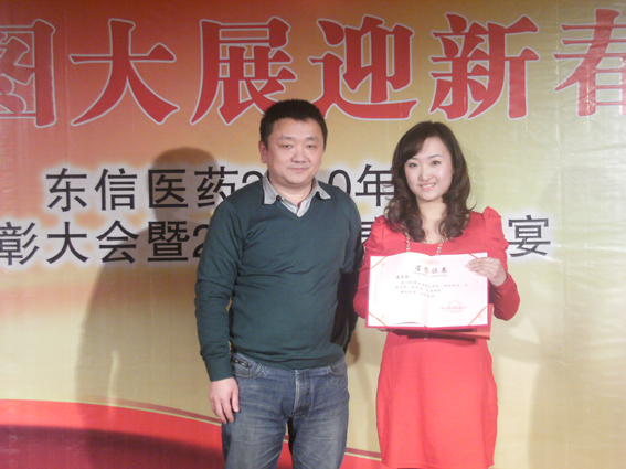在過去的一年里,奮戰(zhàn)在各條戰(zhàn)線的東信人與公司同風(fēng)雨、共命運(yùn)、用不懈的努力為公司的發(fā)展做出了自己的貢獻(xiàn)。一首深情的《回家》之后,晚會(huì)進(jìn)入東信醫(yī)藥2010年度總結(jié)表彰大會(huì)的激情時(shí)刻。公司總經(jīng)理陳向先生及銷售部、業(yè)務(wù)管理部、市場部、商務(wù)部的主要領(lǐng)導(dǎo)揭曉了“東信醫(yī)藥2010年度總結(jié)表彰大會(huì)”的各個(gè)獎(jiǎng)項(xiàng),向贏得榮譽(yù)和尊重的先進(jìn)團(tuán)隊(duì)和先進(jìn)個(gè)人頒發(fā)了獎(jiǎng)品和證書。