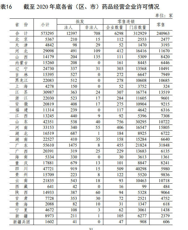 日前,國家藥品監督管理局綜合和規劃財務司及國家藥品監督管理局信息中心發布《藥品監督管理統計年度報告(2020年)》(以下簡稱《報告》),《報告》分別對2020年藥品、醫療器械、化妝品的相關行政受理、審批、監管等情況進行了匯總分析,披露了包括藥店數量、執業藥師數量等不少藥店最關心的數據。