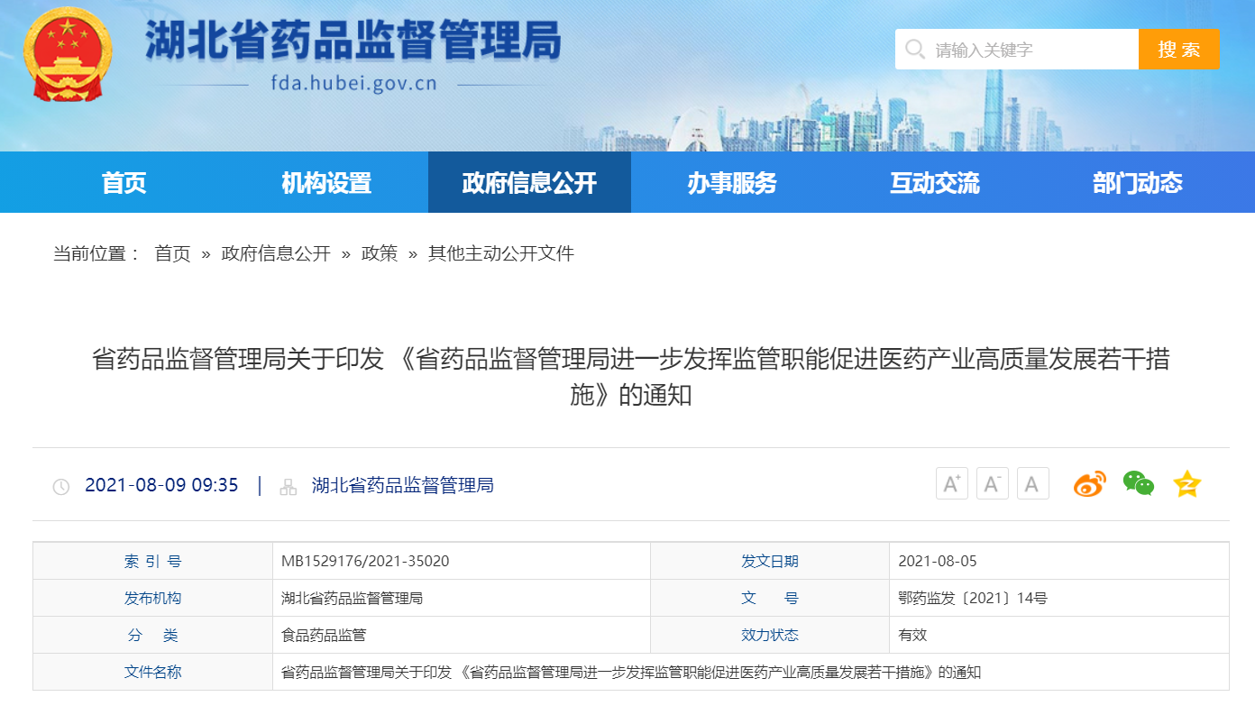 8月5日,湖北省藥監局官網發布關于印發 《省藥品監督管理局進一步發揮監管職能促進醫藥產業高質量發展若干措施》的通知,出臺26項措施推動湖北省醫藥產業高質量發展。