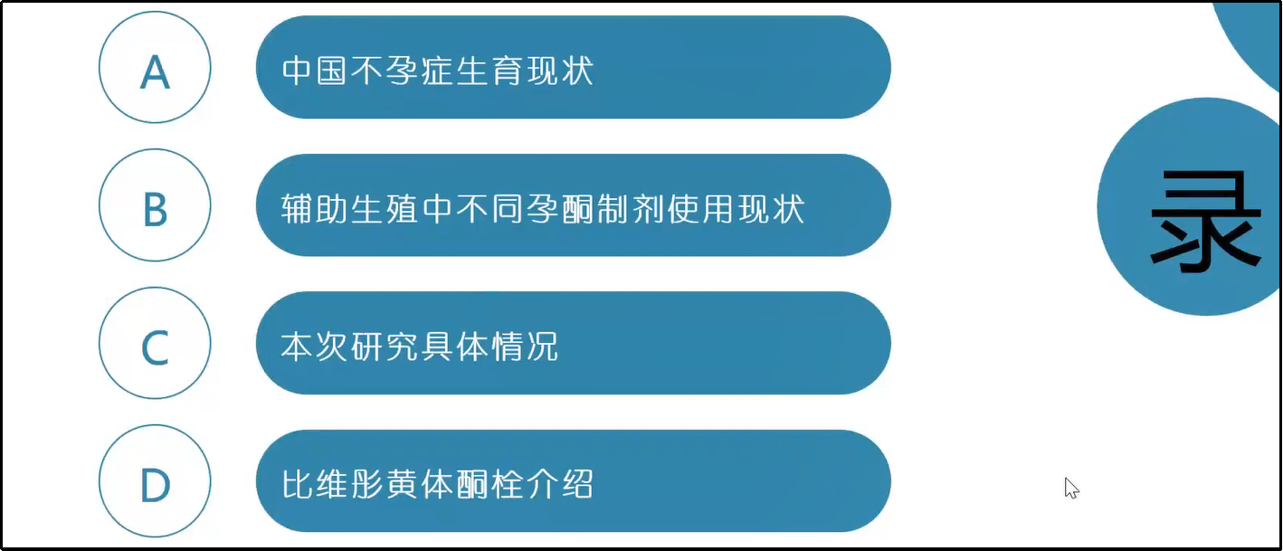 會議第二部分,由復旦大學附屬中山醫院生殖醫學中心季曉薇教授進行《黃體酮栓和黃體酮軟膠囊在激素替代FET周期的臨床療效比較》研究講解,從中國不孕癥生育現狀、輔助生殖中不同孕酮制劑使用現狀、本次研究具體情況、比維彤黃體酮栓介紹四個維度進行研究講解。