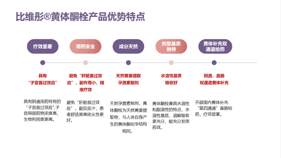 隨后,高主任介紹了各類黃體支持藥物的前世今生,并分別陳述各自的利弊:傳統的黃體支持制劑包括口服劑和注射劑,但這兩種劑型都具有局限性:口服制劑雖然使用方便,但由于存在肝臟首過效應,給藥后子宮靶器官中的藥物濃度低,同時伴有全身不良反應;黃體酮肌內注射較經濟,但需多次往返醫院注射,也因其為油性溶液,長期肌注可導致注射部位紅腫、結節或過敏反應,并且會加重患者的肝腎功能負擔。比維彤®黃體酮栓劑經陰道和直腸給藥,減少了患者的全身不良反應,不加重患者肝腎功能負擔,臨床應用吸收率高,安全性好,目前已成為國際主流給藥方式。
