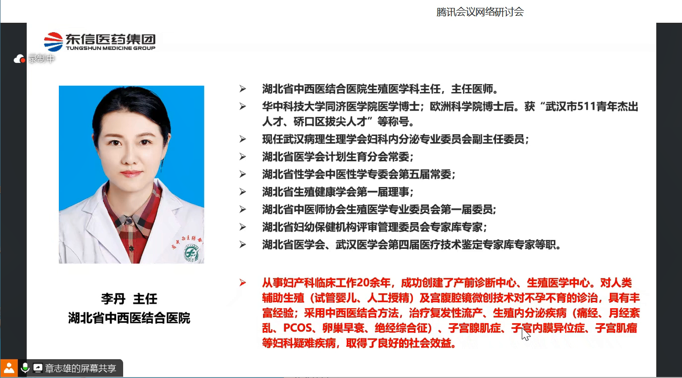 隨后,湖北省中西醫結合醫院李丹主任分享了比維彤栓在生殖科的應用,并介紹了比維彤®栓的特點:本產品經陰道給藥,患者可自行完成,吸收充分且無痛苦,患者間吸收差異較小,使用安全且副作用低,是理想的黃體支持給藥方式。
