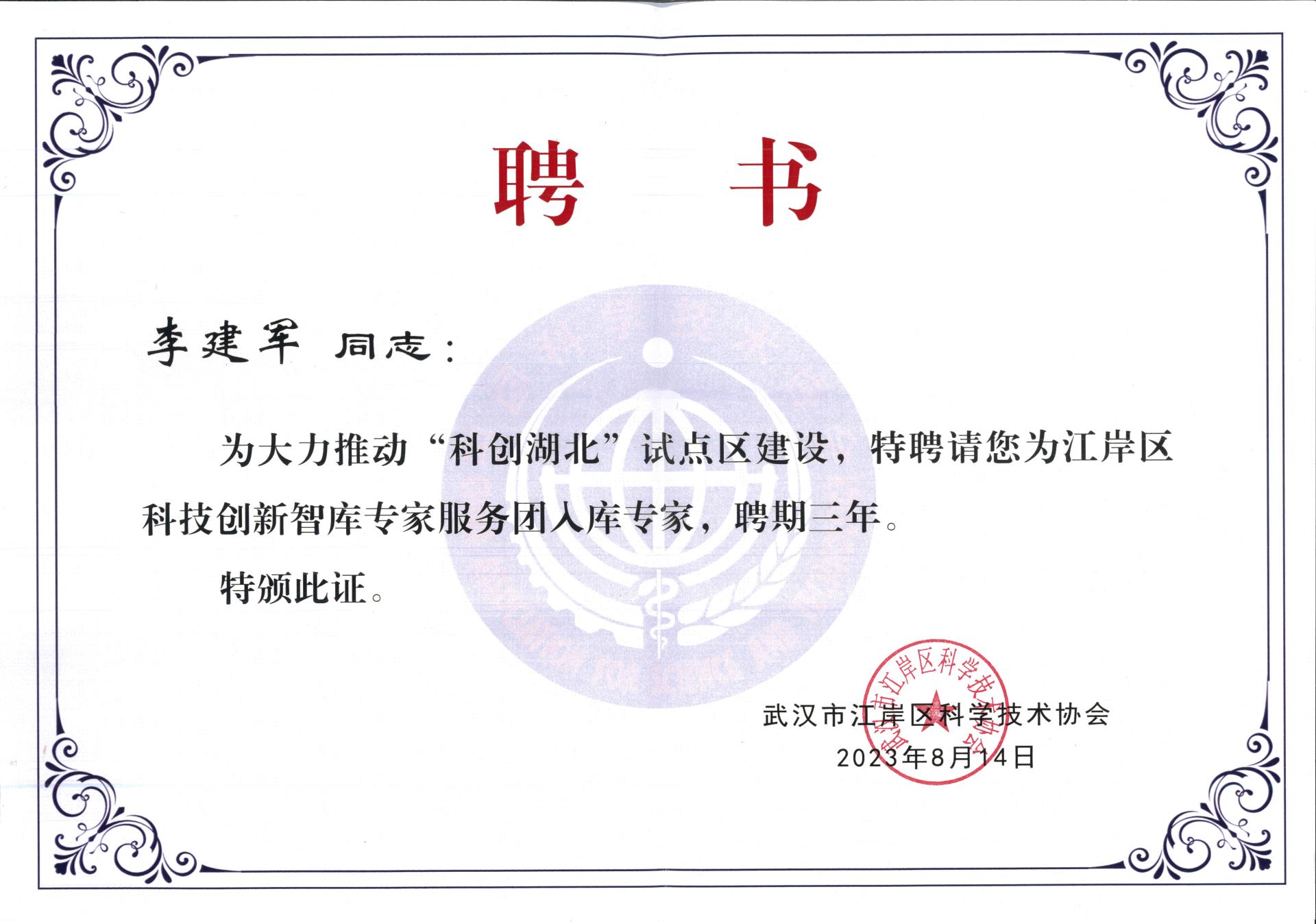10月31日,由湖北省科學(xué)技術(shù)協(xié)會主辦,江岸區(qū)人民政府等單位協(xié)辦的2023“科創(chuàng)湖北”學(xué)會專家荊楚行(武漢·江岸站)活動在武漢市江岸區(qū)舉行,湖北省、武漢市科學(xué)技術(shù)協(xié)會領(lǐng)導(dǎo),湖北省學(xué)會、高校專家,江岸區(qū)領(lǐng)導(dǎo)等出席了會議。湖北東信醫(yī)藥有限公司總經(jīng)理李建軍被武漢市江岸區(qū)科學(xué)技術(shù)協(xié)會聘為科技創(chuàng)新智庫專家服務(wù)團入庫專家并應(yīng)邀出席會議。