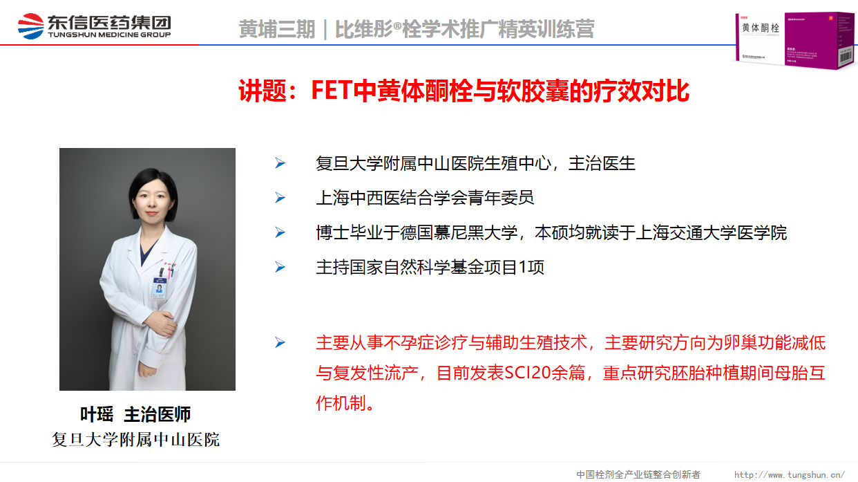 在專家授課環節,復旦大學附屬中山醫院生殖科葉瑤醫師帶來了《FET中黃體酮栓與軟膠囊臨床對比》,葉老師介紹了黃體酮栓劑較肌注使用更為方便,不會有疼痛感,大大避免了痛苦的副作用和不良反應,同時不會產生口服黃體酮制劑生物利用度低、容易產生頭暈的弊端。隨后葉老師通過回顧性分析比較了黃體酮栓劑與軟膠囊在凍融胚胎移植的療效,黃體酮栓劑有著更高的妊娠率以及更低的早期流產率。