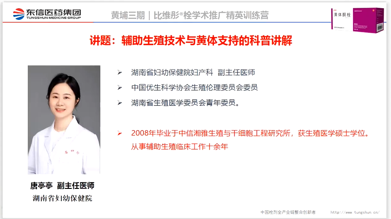 湖南省婦幼保健院生殖醫學中心的唐亭亭老師為大家帶來了《輔助生殖技術與黃體支持的科普講解》,唐老師先給大家介紹了什么是不孕癥和輔助生殖技術,也介紹了輔助生殖技術中黃體支持的必要性。最后唐老師講解了黃體支持的常用藥物,其中黃體酮栓因采用水溶性基質—硬脂酸聚烴氧酯,具有快速溶解、增加藥物分解、提高生物利用度和藥效的作用。并且還可直腸給藥,藥效并不會降低。