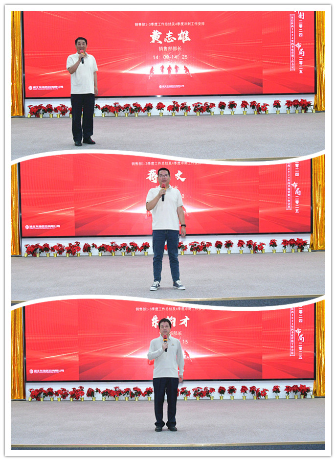 銷售部部長黃志雄、蔣文、朱柏才在匯報中亮出了南區、北區、科技產品一至三季度的成績單,并圍繞“沖刺2024,布局2025”的會議主題,匯報了四季度的重點工作計劃。銷售總監張湘文全面總結了銷售部前三季度的業績達成情況,并對五大工程的推進、秋季PK活動、銷售計劃的制定等重點工作提出了具體的要求。