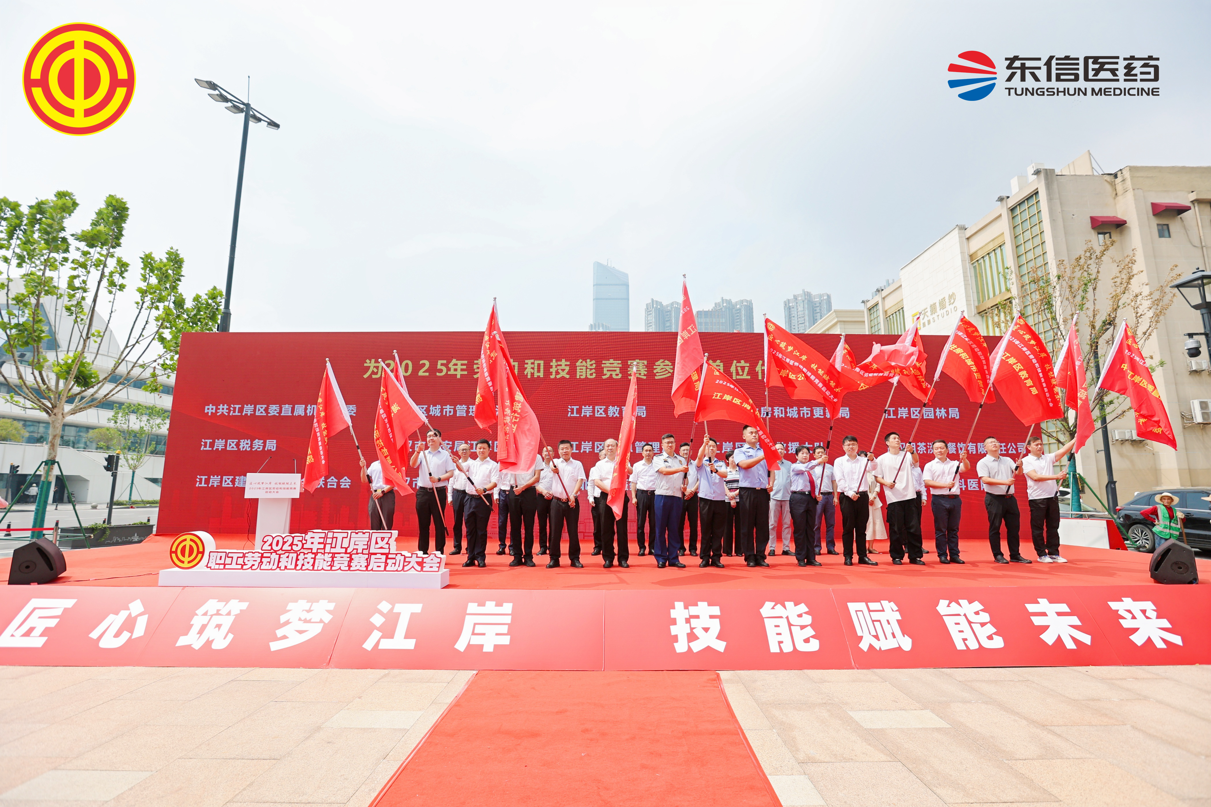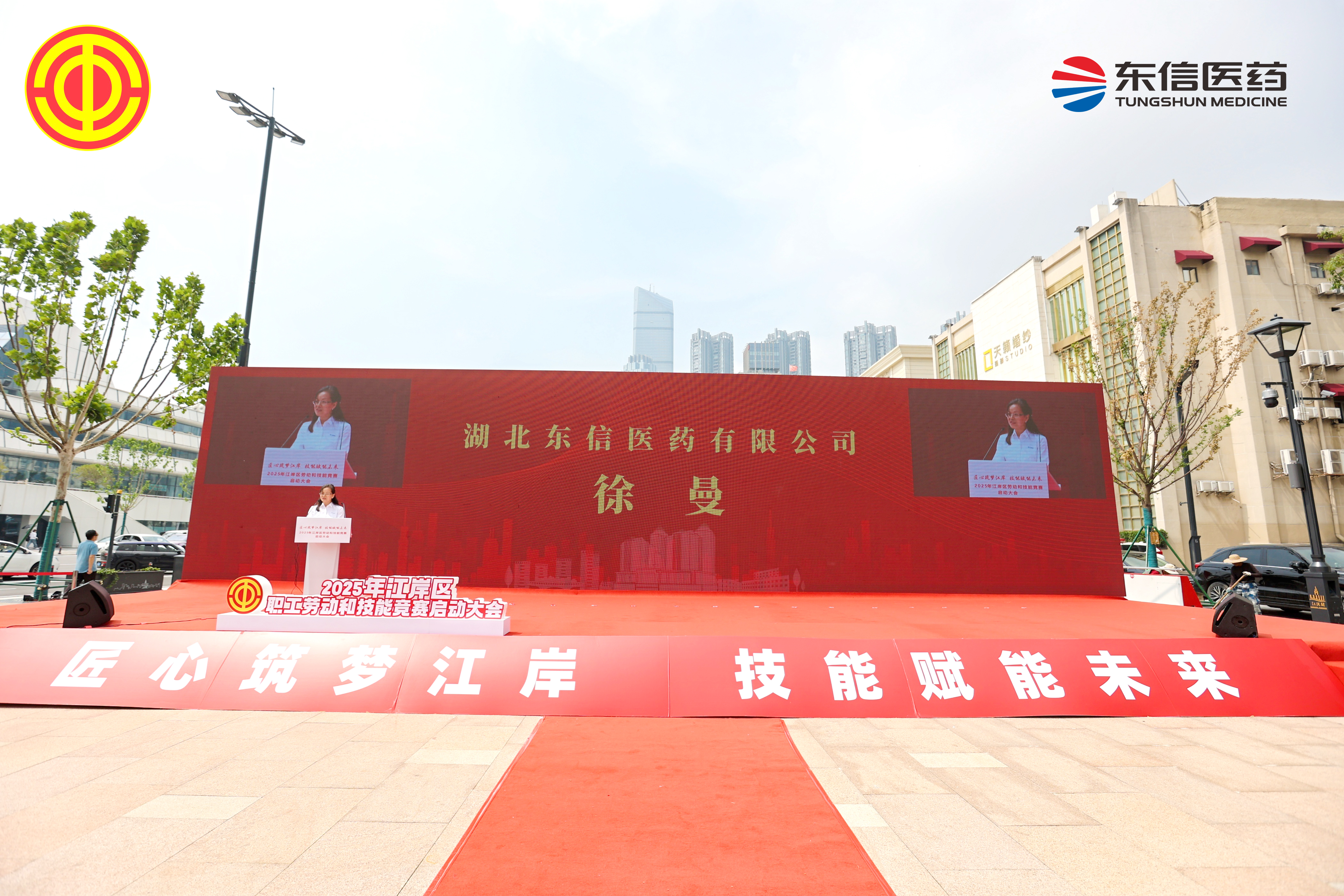 5月16日,武漢市江岸區勞動和技能競賽啟動儀式在江漢關城市廣場隆重舉行,湖北東信醫藥有限公司黨支部書記張琳、工會主席徐曼等16名工會會員參加了儀式。