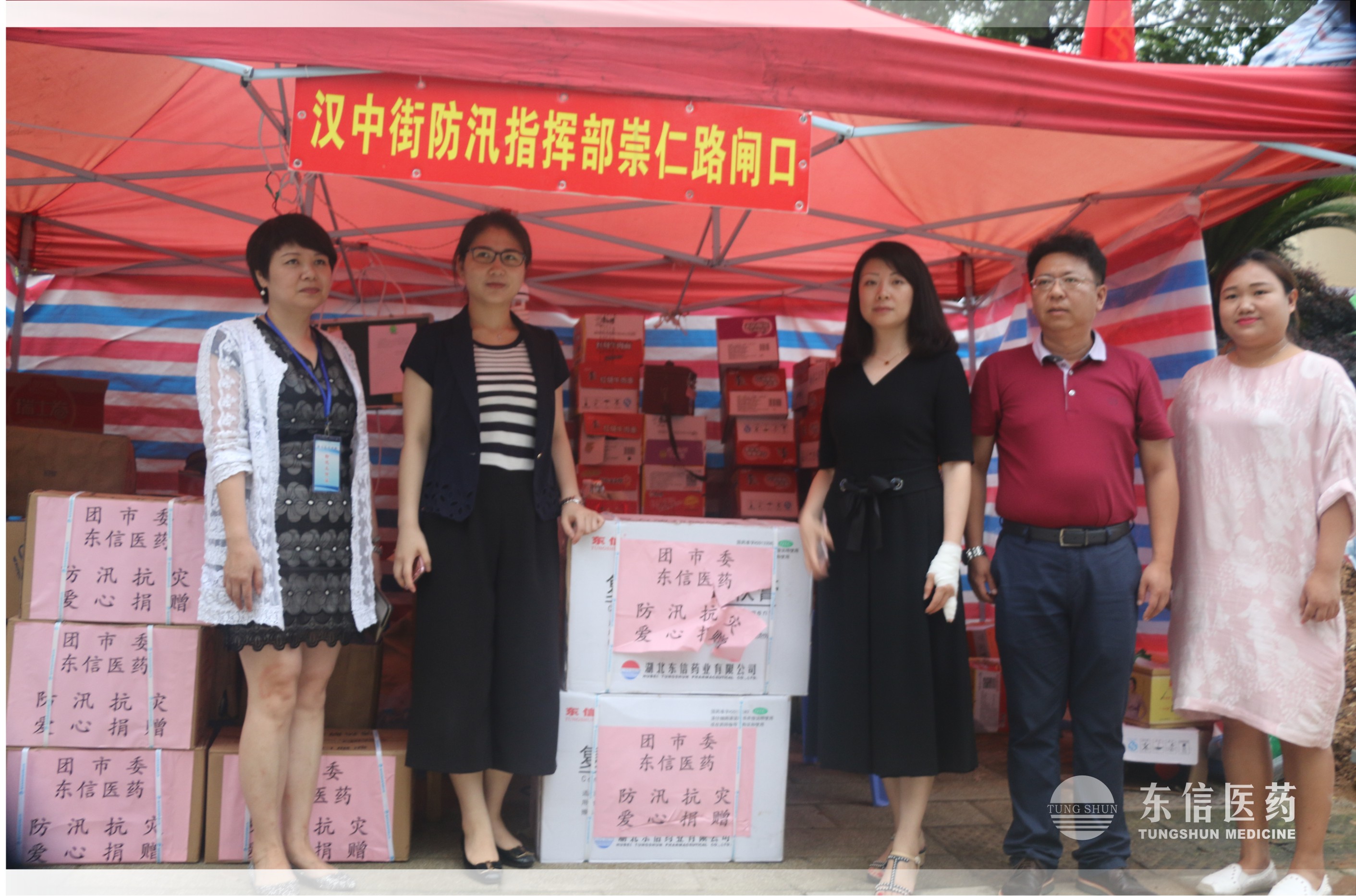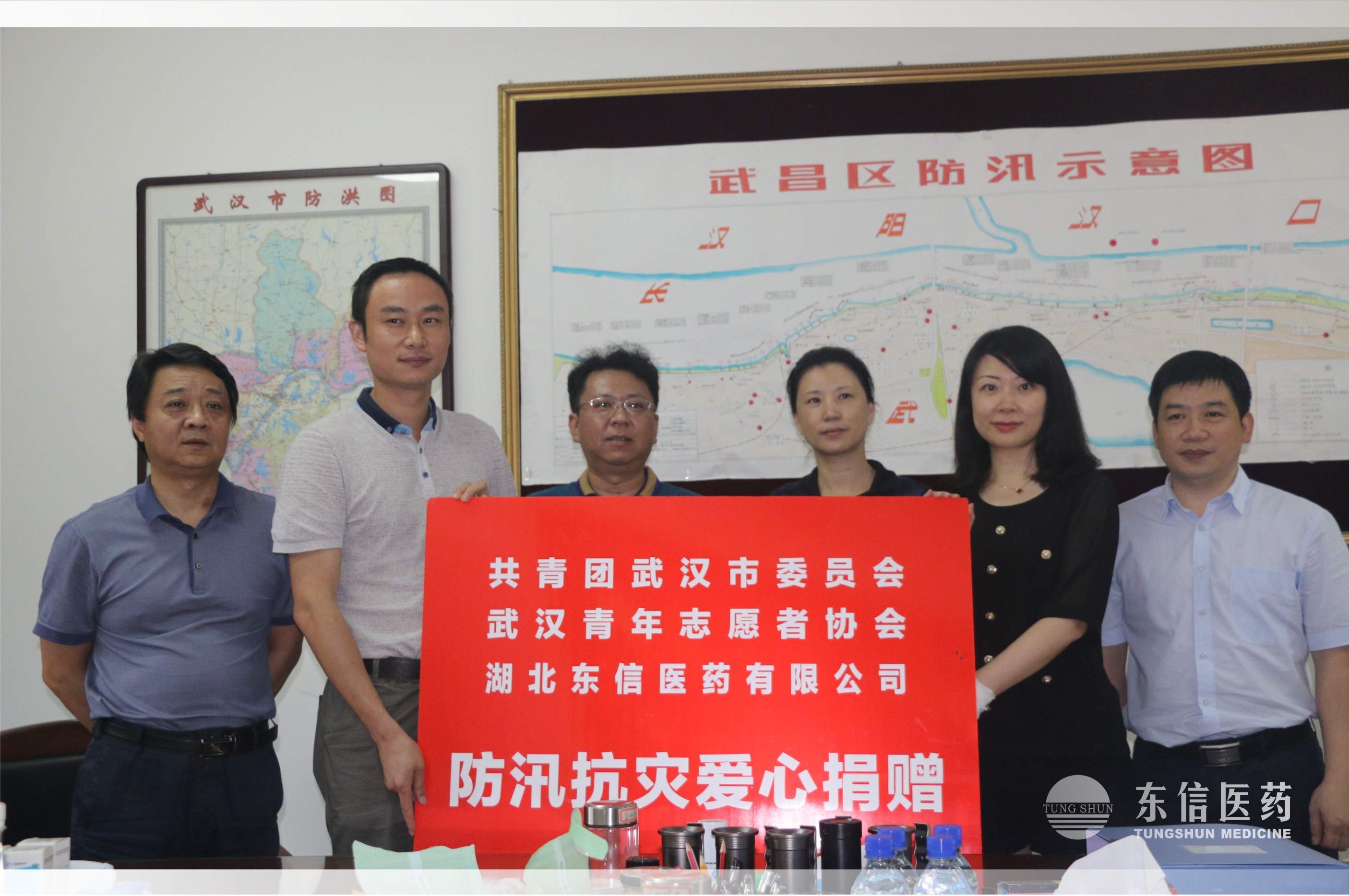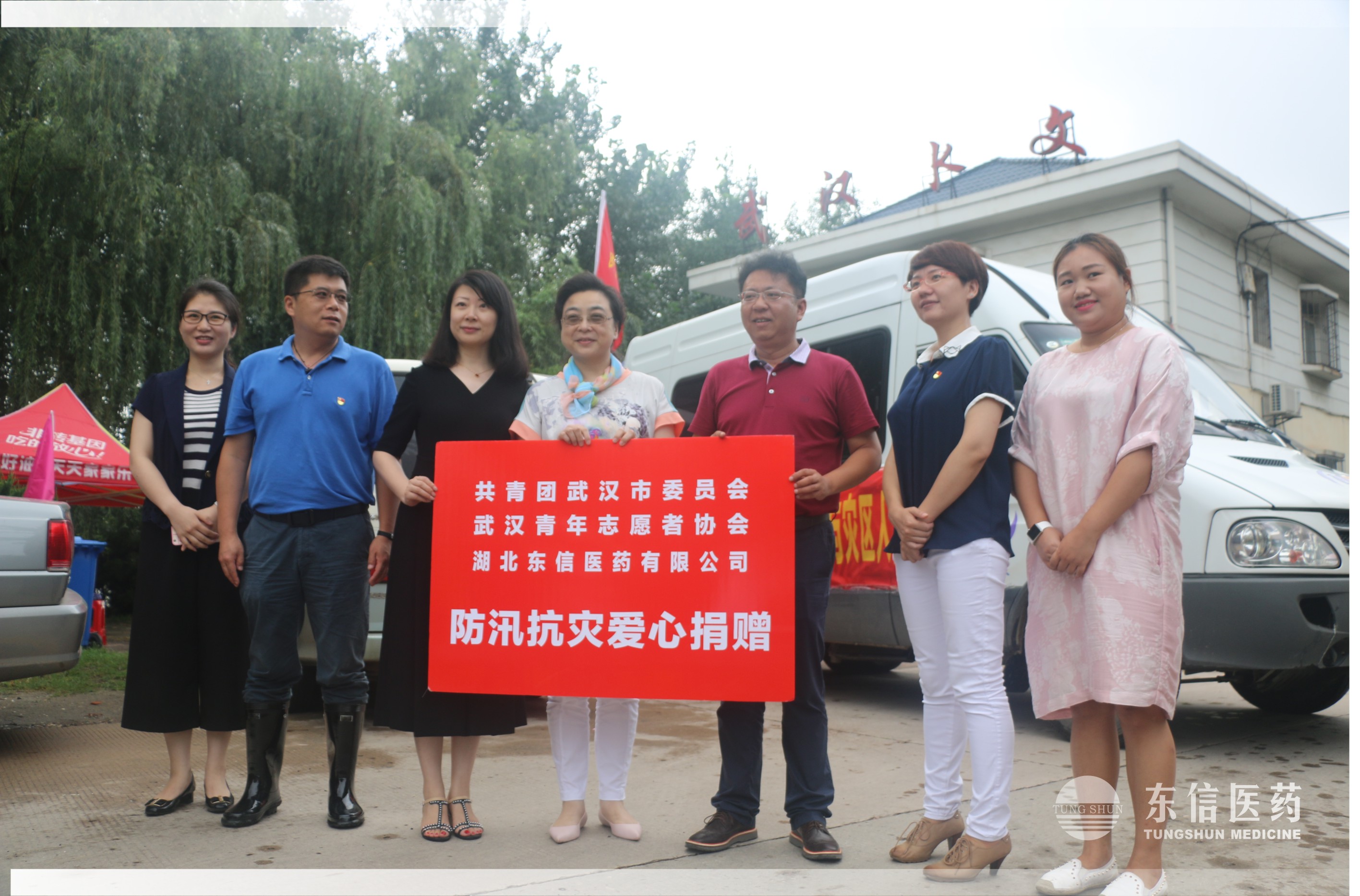 7月15日,共青團武漢市委、武漢市青年志愿者協會攜手東信醫藥集團向蔡甸災區、漢陽區永豐街、硚口區易家街、硚口區漢中街、武昌區抗洪一線人員捐贈價值20萬元的防署降溫藥品。
